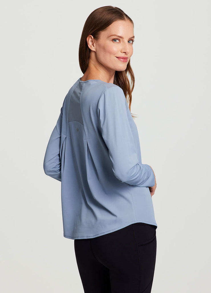 Featuring airy mesh inset panels, quick drying fabric and a versatile design, our Extra Mile Mesh Tee is the perfect transitional workout top. This long sleeve crewneck tee is made from lightweight stretch fabric that's smooth and soft to the touch and features pleat back detail for a stylish touch. Plus with an easy fit and regular length that's slightly longer in back for added coverage, it's perfect to take from studio to street.
