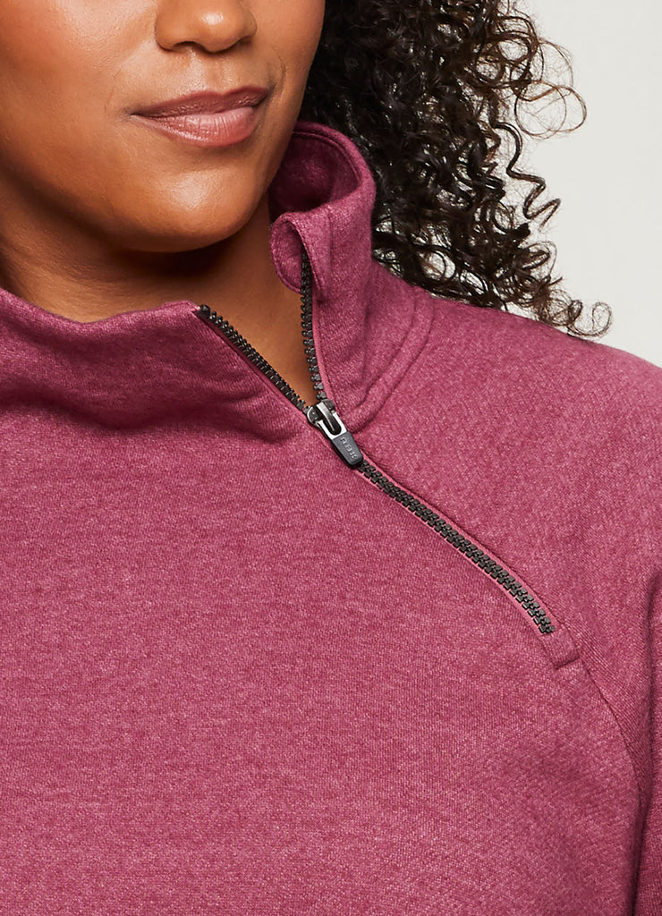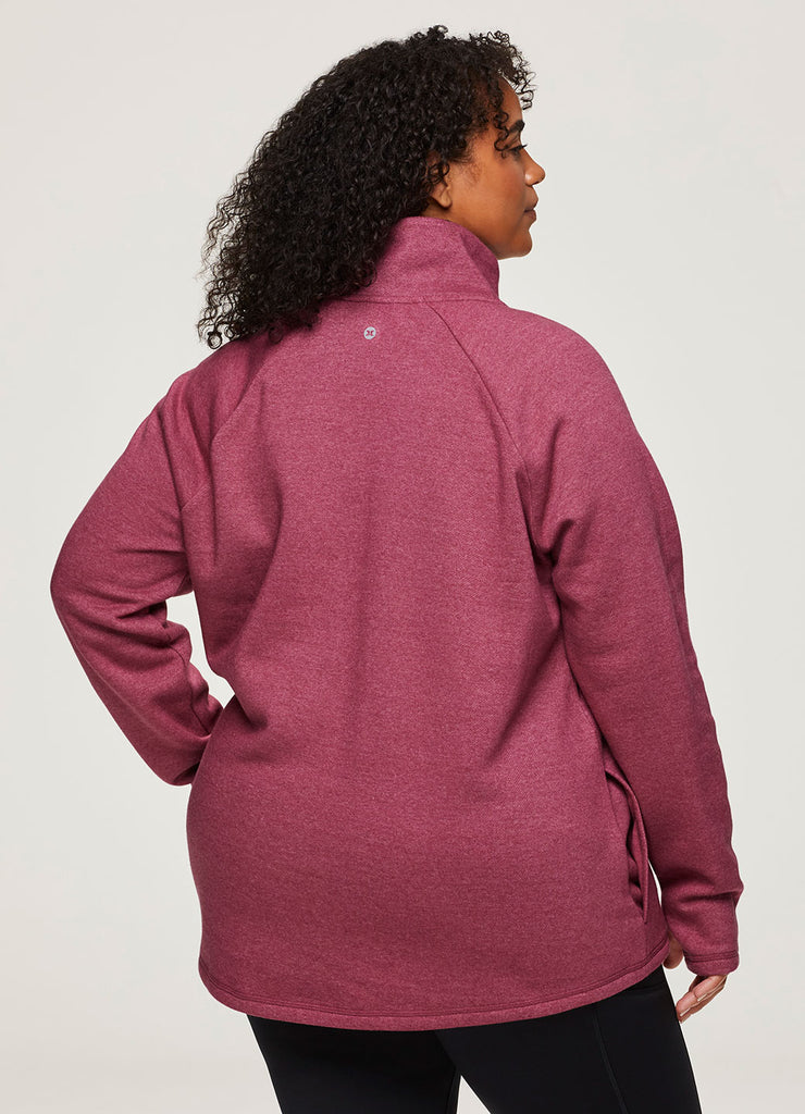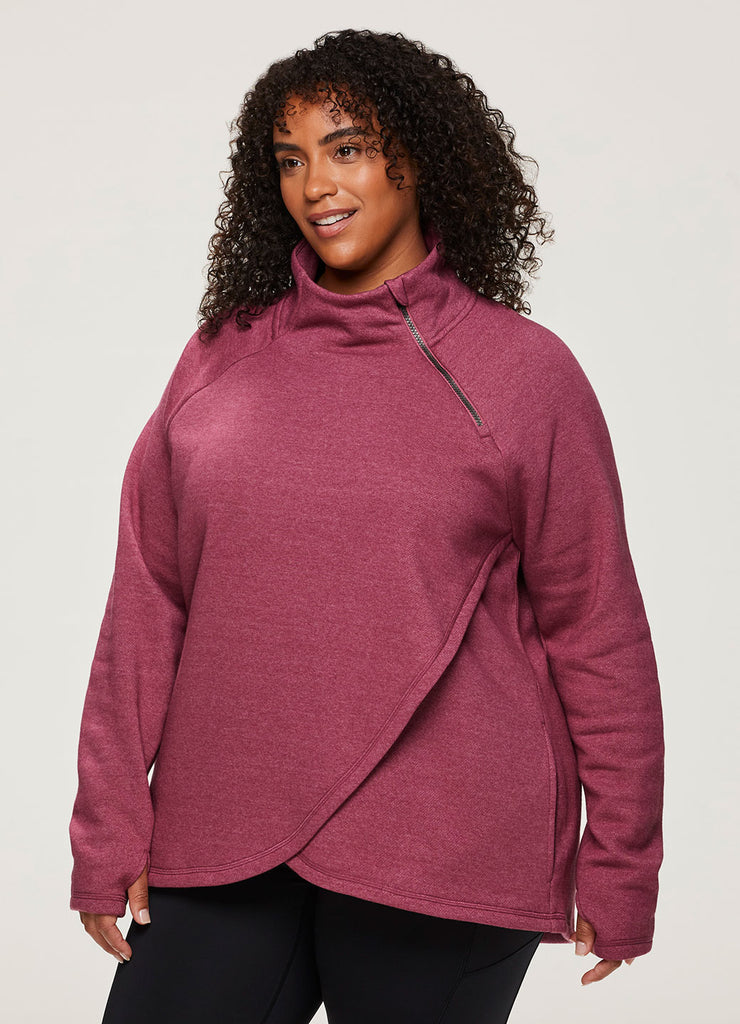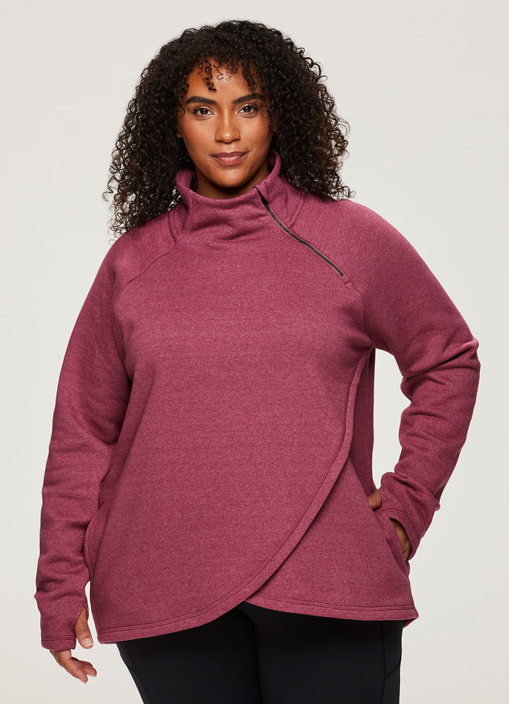 Hang out in comfort and style with the Prime Ready To Roll Fleece Zip Mock Pullover sweatshirt. Its faux wrap hemline creates a flattering, feminine fit while also adding a subtle fashionable detail. The cotton blend fleece fabric is soft and breathable. The asymmetric zip mock neck allows for a customizable fit while providing extra comfort and warmth. Finished with convenient side pockets and thumbholes on the sleeves, this top will be your new go to sweater for those colder weather months. Available in sizes XS-3X.