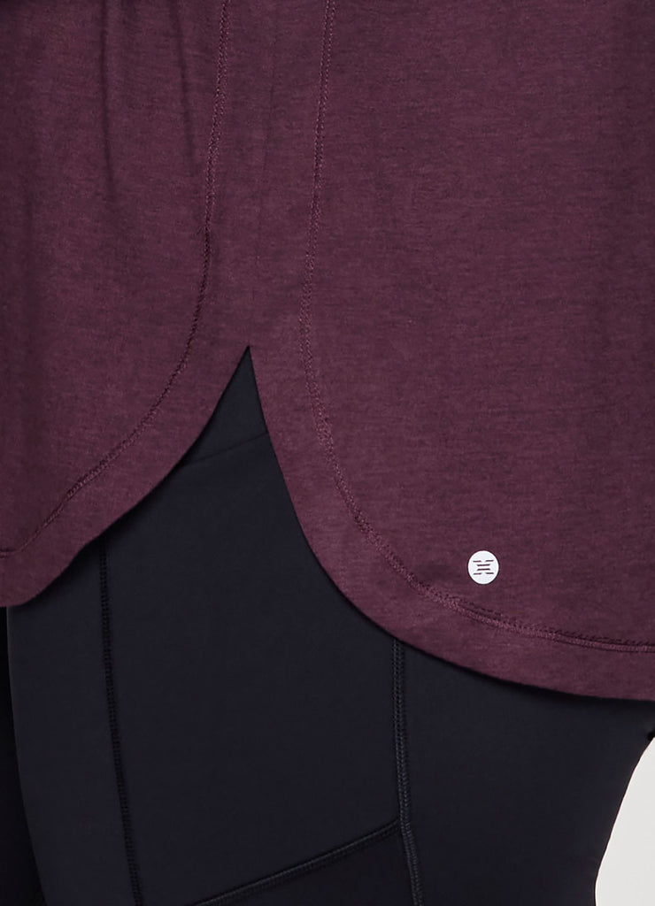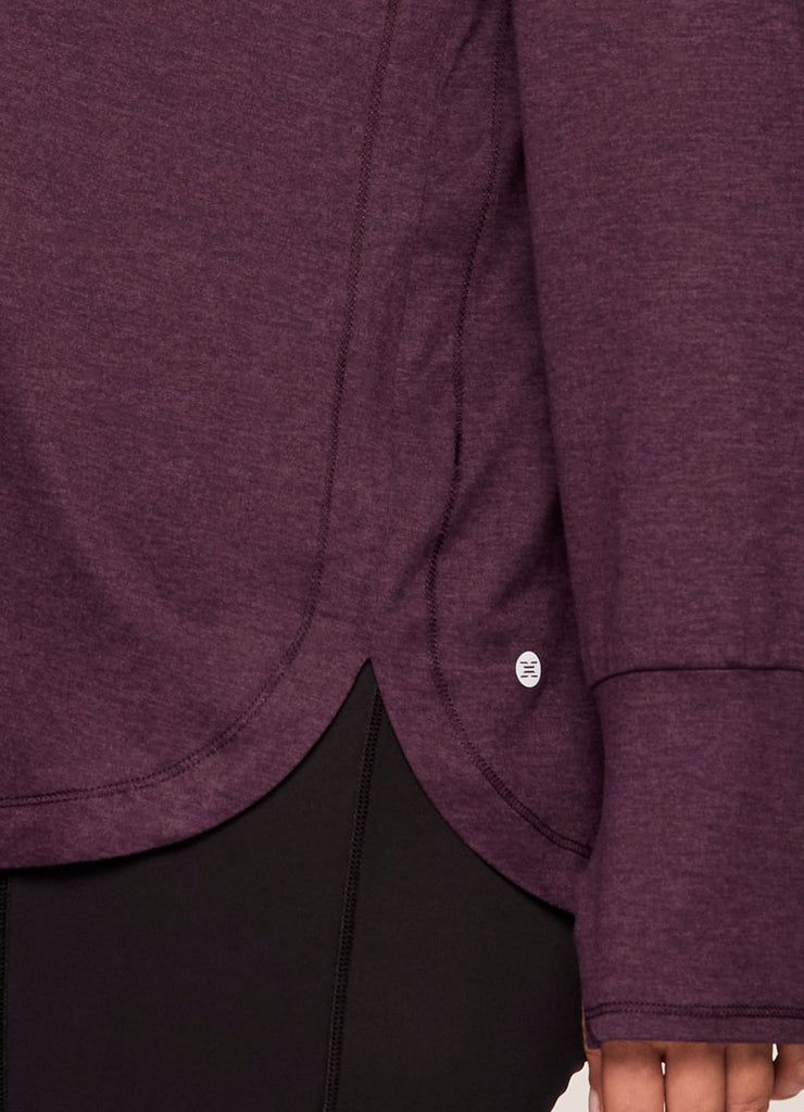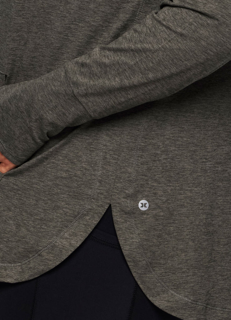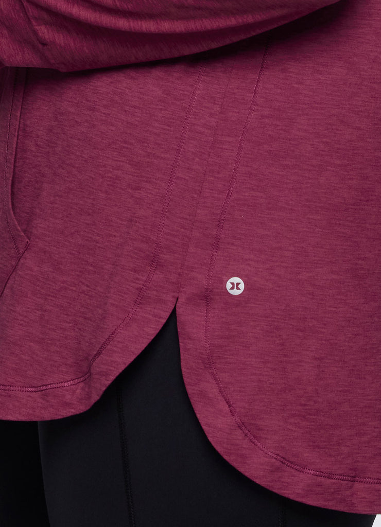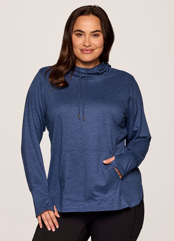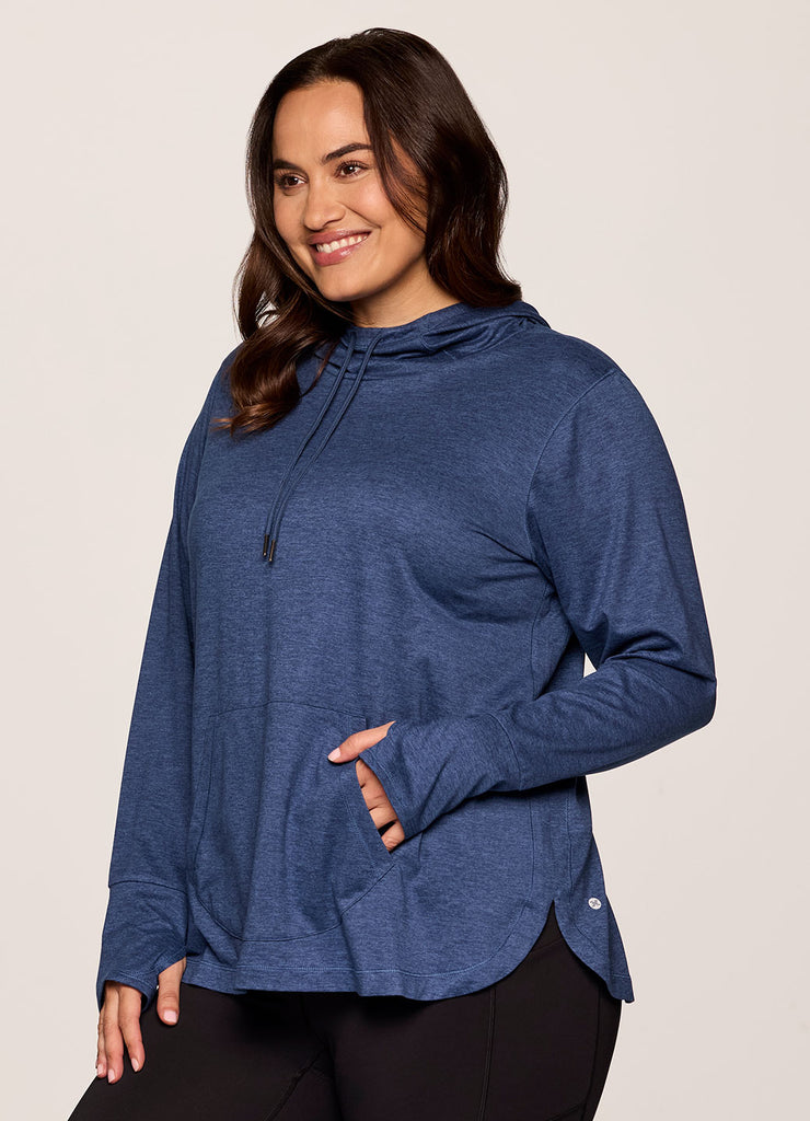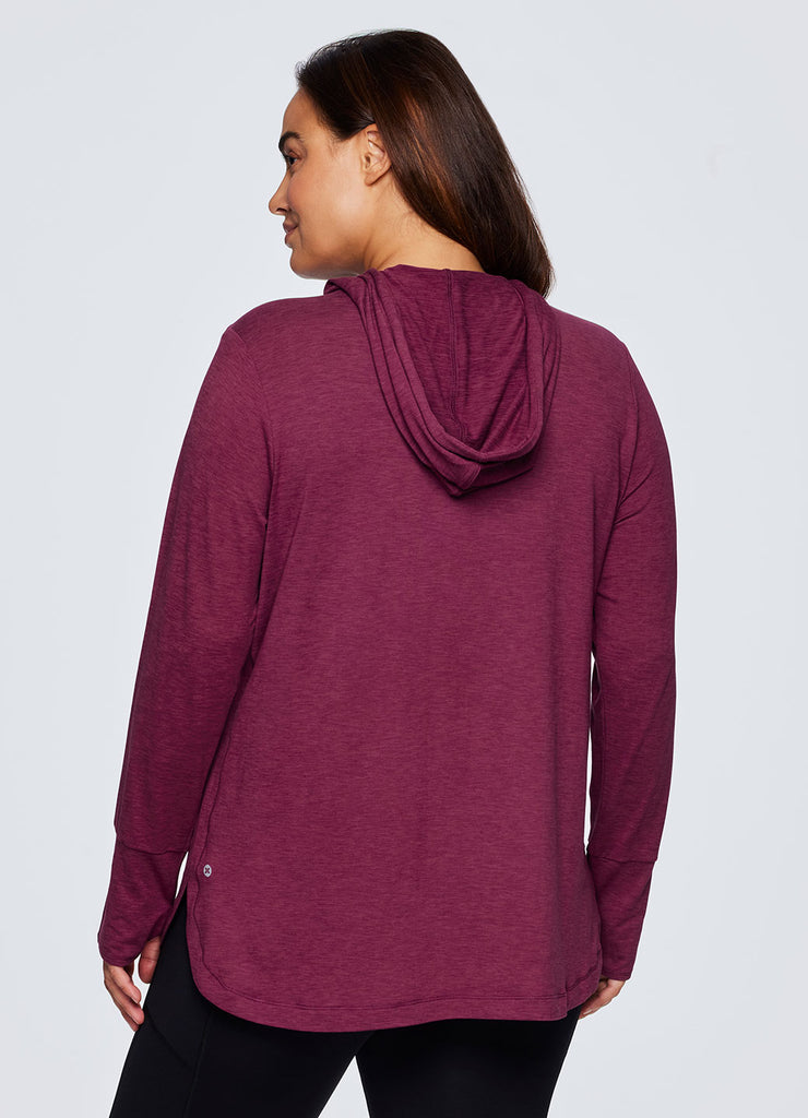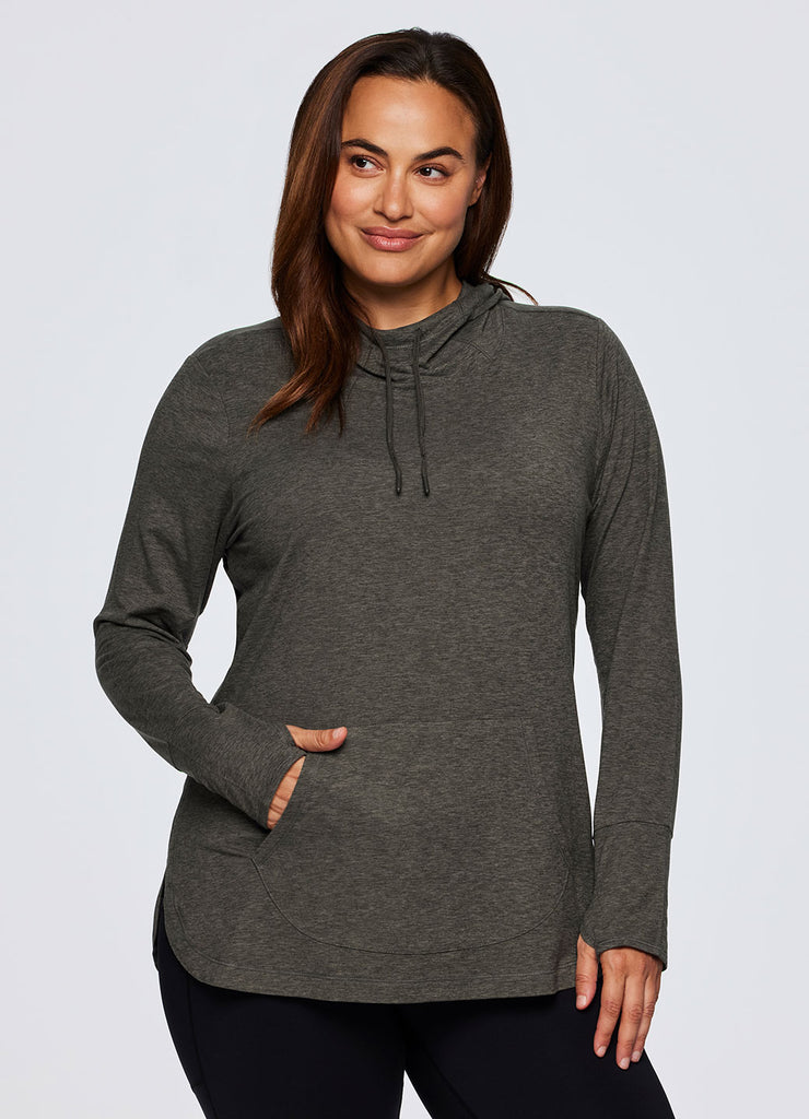 The lightweight Studio Breathe Super Soft Hoodie Tunic is constructed from our upgraded EverydaySoft peached jersey fabric for supreme comfort. The attached hood comes equipped with adjustable drawstrings, plus thumbholes at the wrists help enhance mobility while keeping sleeves in place. Its shaped silhouette is accentuated by side slits and a curved hemline for a feminine and flattering look. Complete with a convenient front pocket to place your phone, keys or hands, this functional hoodie top is a must-have for athleisure wardrobe!