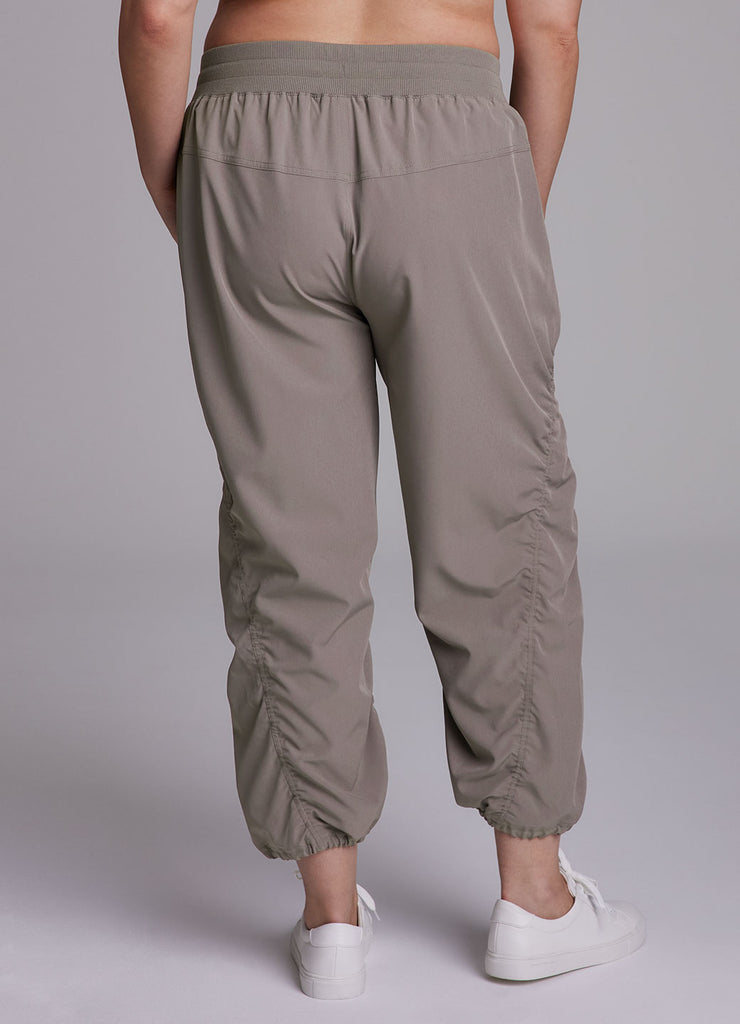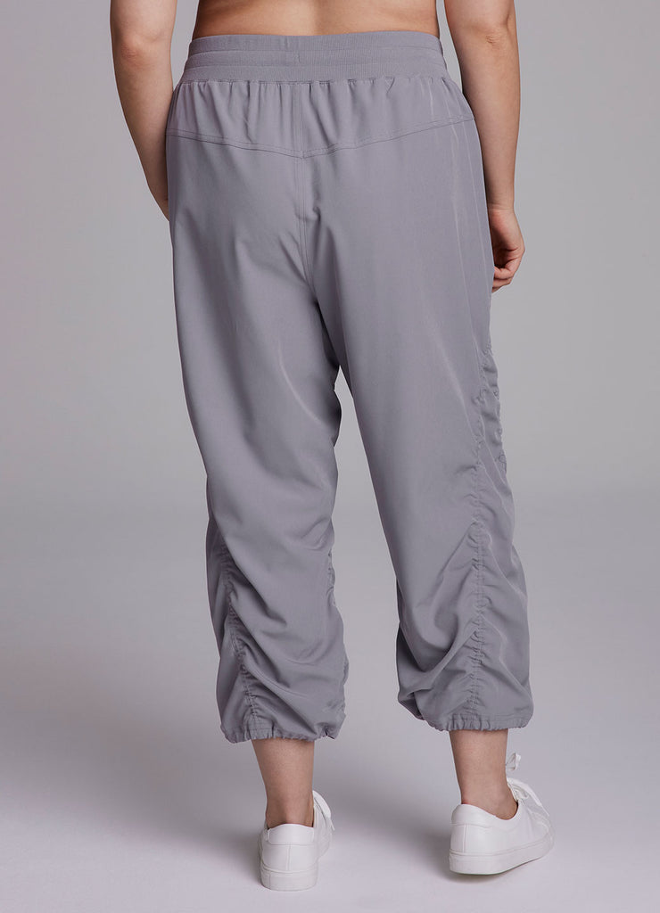 Elastic drawstring waistband and adjustable leg openings allow for a more customized fit