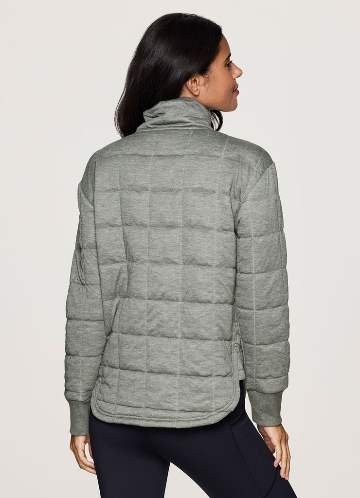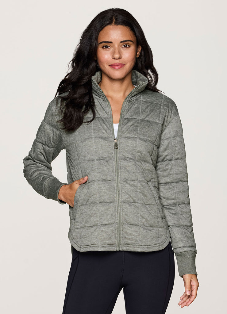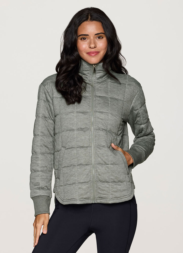 Upgrade your athleisure wardrobe with our Perfect Weekend Quilted Jacket. Elevated design details include curved lines, large grid quilted fabric, a mock neckline and ribbed wrist cuffs, while ultra lightweight, soft heathered fabric is great for layering. Plus, side pockets, a full zip-up closure and a longer hemline in back for added coverage ensure a practical, lightweight jacket you can easily layer and wear across the seasons.