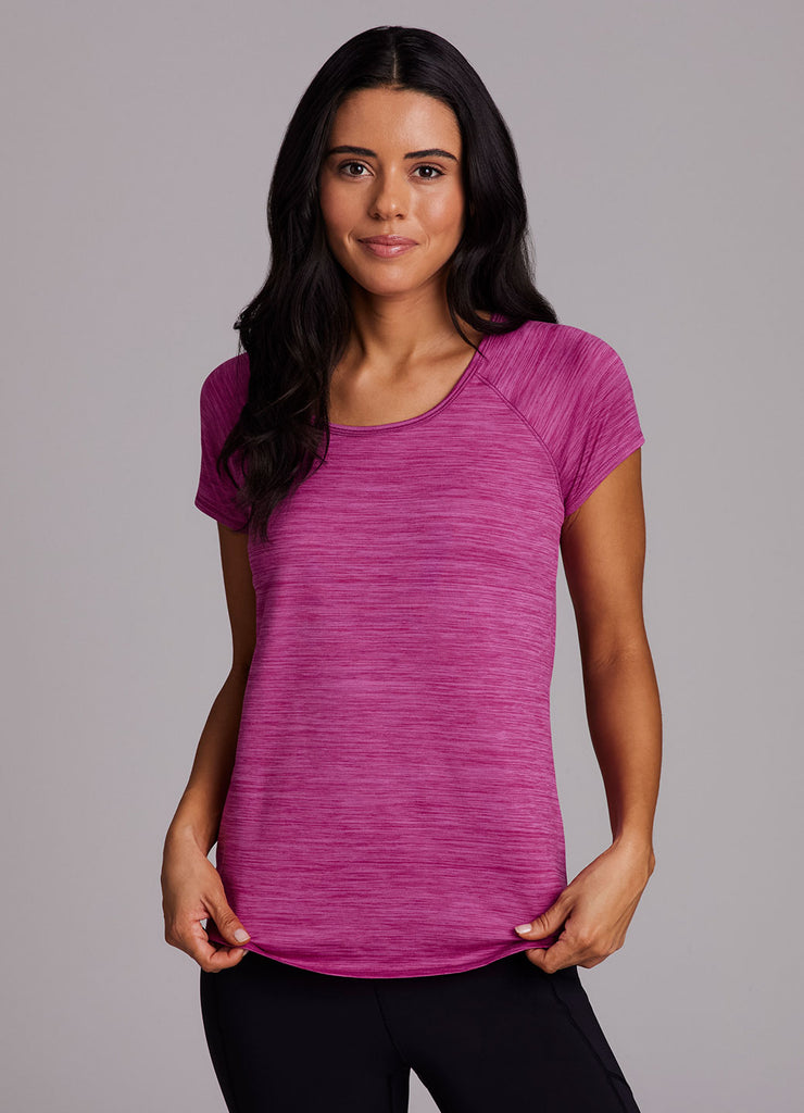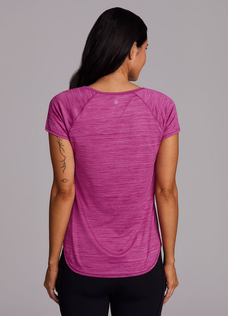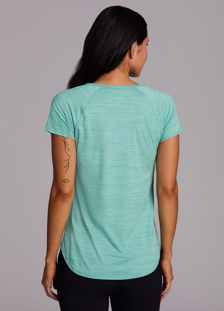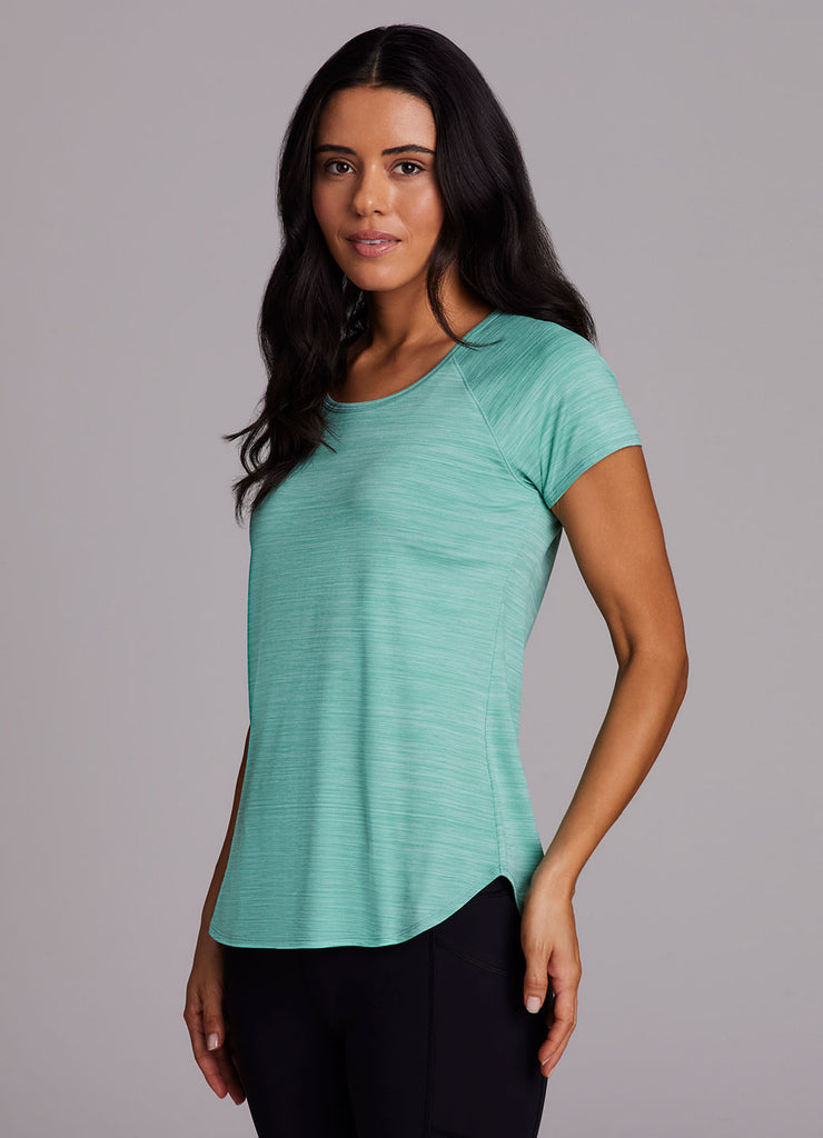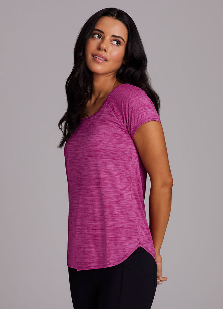 Our Stratus Soft Crewneck Tee is the perfect everyday tee. Constructed from a lightweight, super soft fabric with a touch of spandex in it, this tee is ultra comfortable and retains its shape wear after wear. It features a subtle all-over space dye pattern and a curved hemline that's slightly longer in the back for coverage. From the yoga studio to lunch with friends, this versatile short sleeve tee will quickly become a favorite in your wardrobe.
