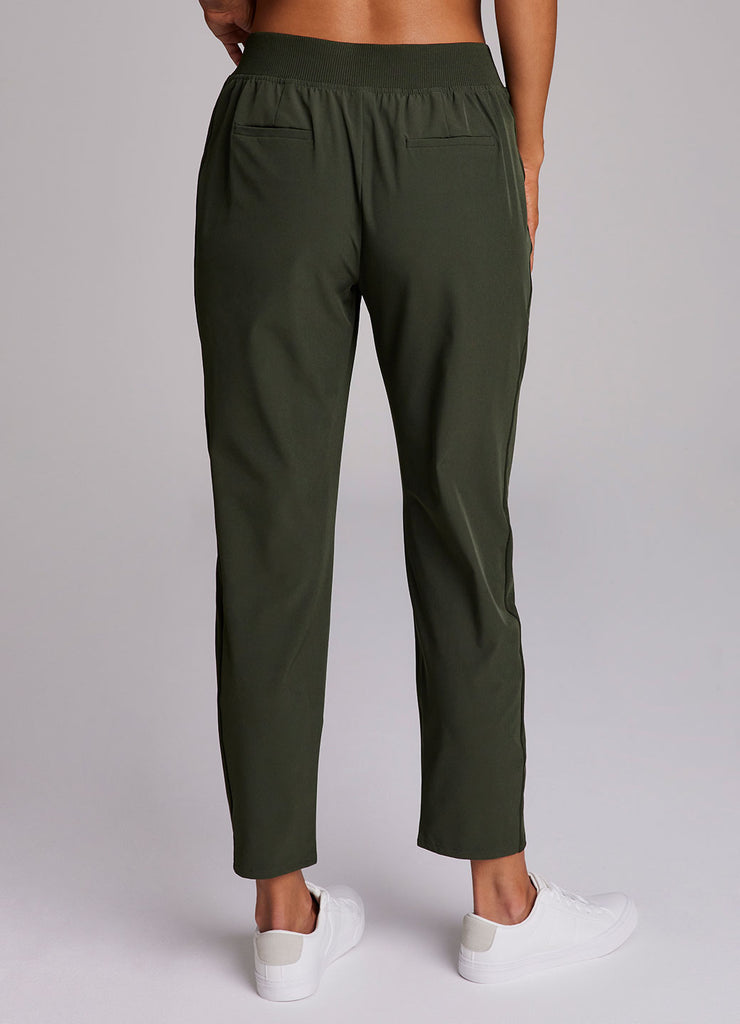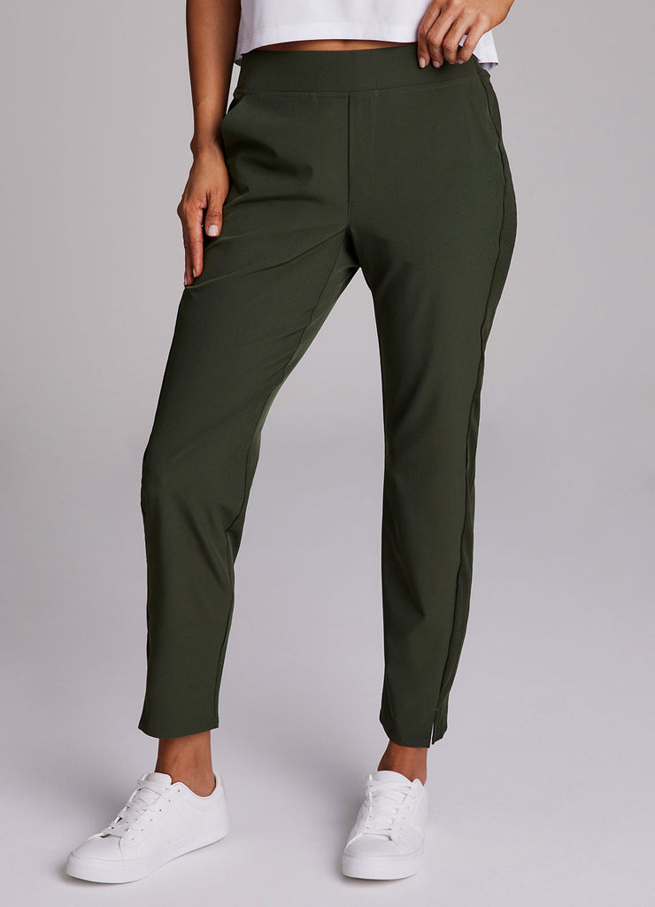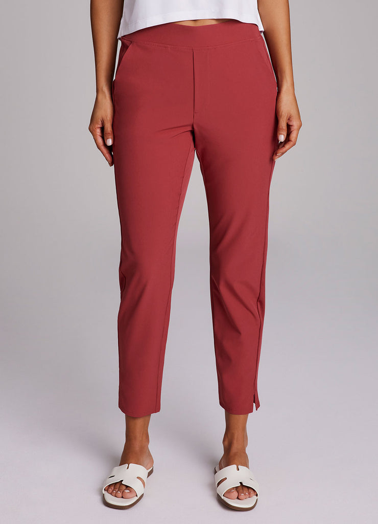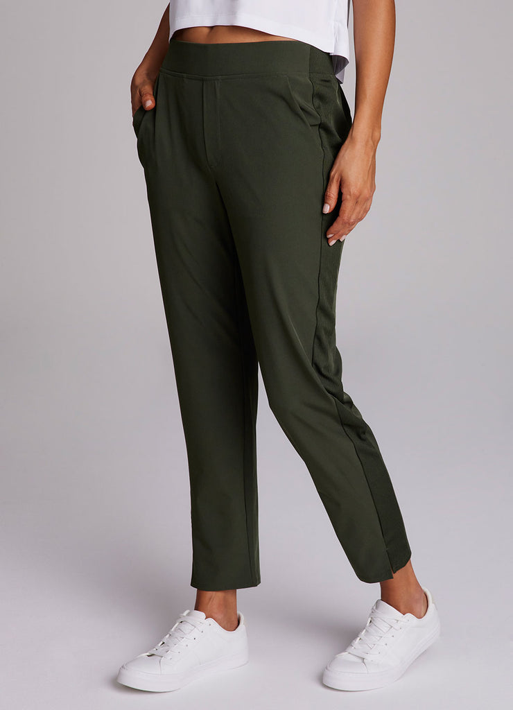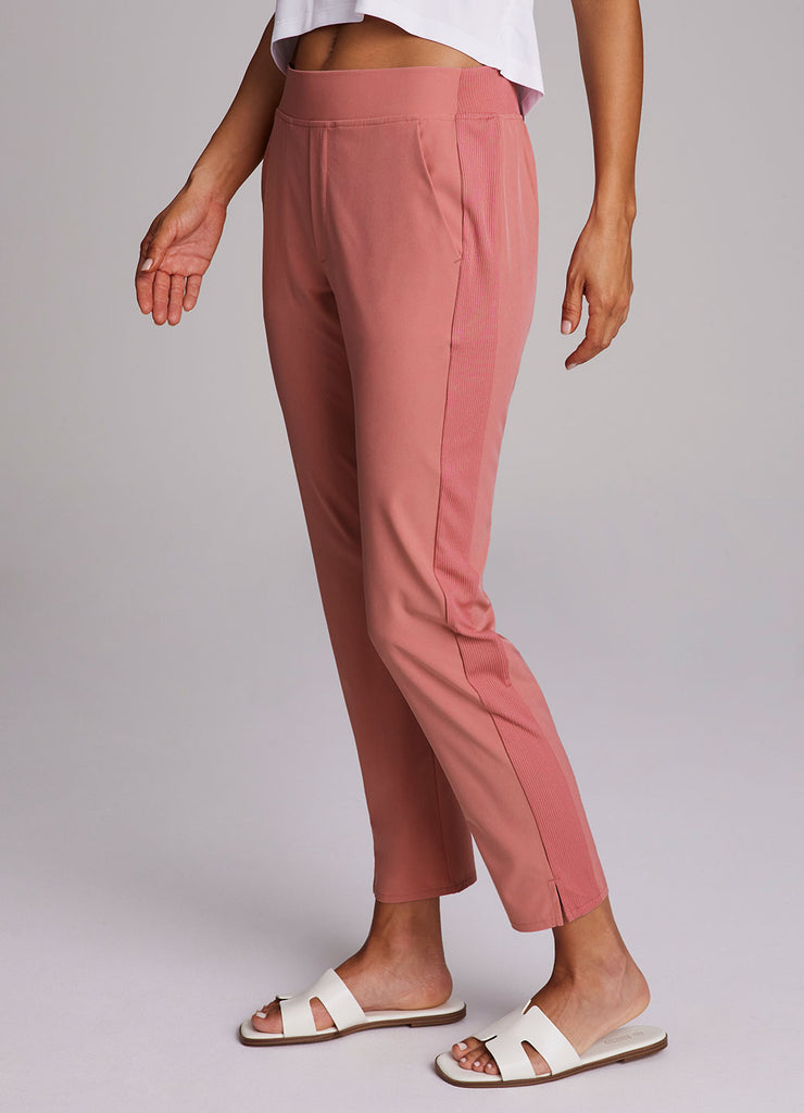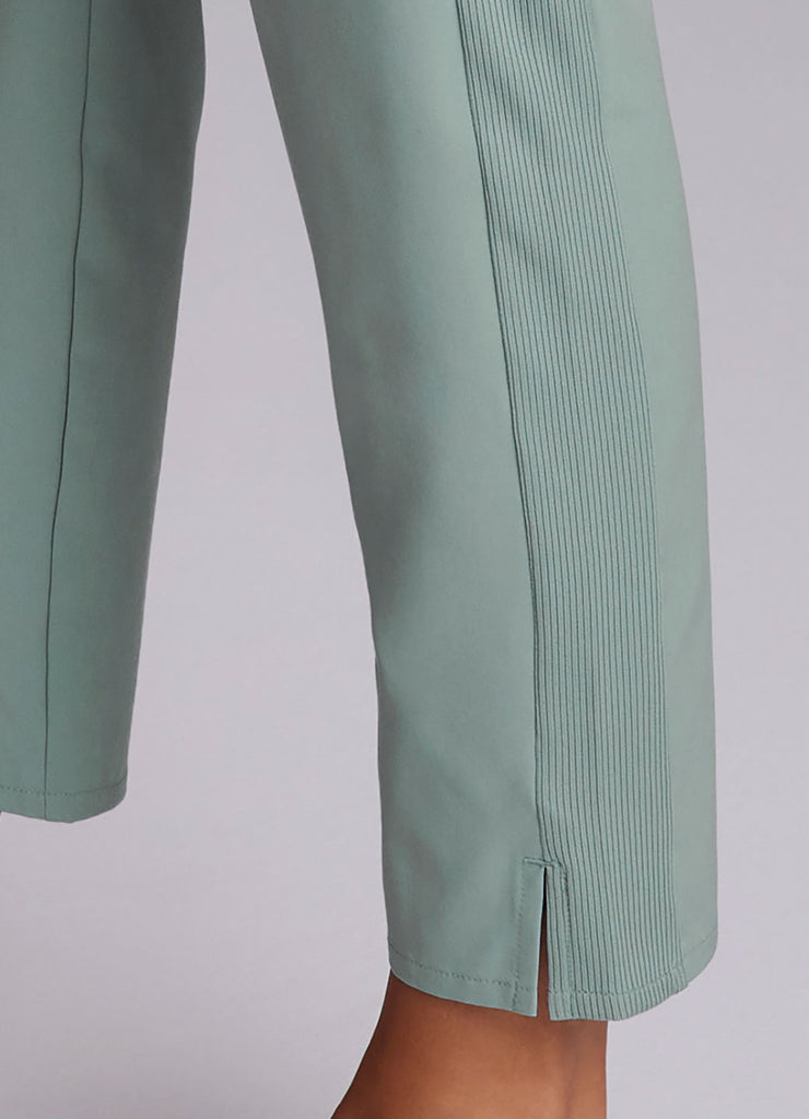 Perfect for everyday wear, traveling, workouts and more, you'll love the Everyday Ribbed Ankle Pant. These versatile ankle length pants are constructed from our breathable, quick drying stretch woven fabric and have a ribbed waistband and side leg detailing. The flat elastic waistband provides both a secure and flattering fit, and sizable side pockets conveniently hold your cell phone and other necessities. Complete with slits at the ankles, faux back pockets and front fly detail, these fashionable pants are a great addition to any wardrobe.
